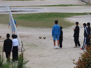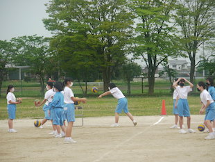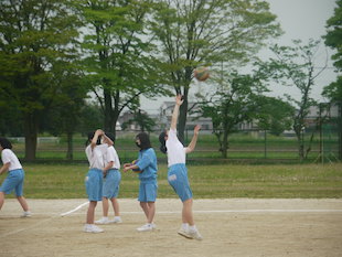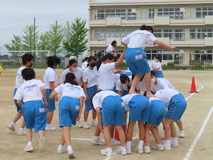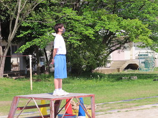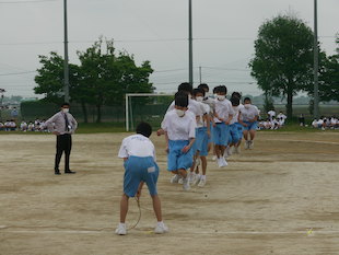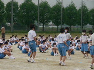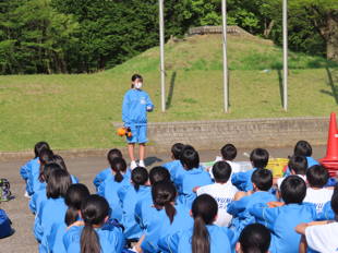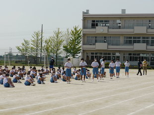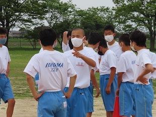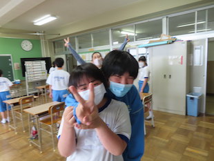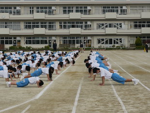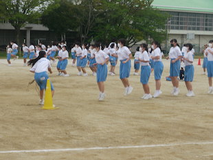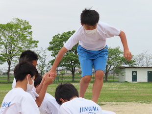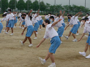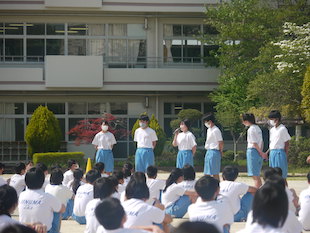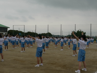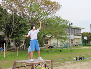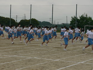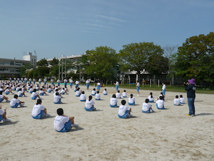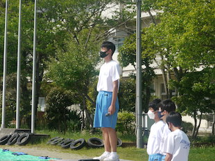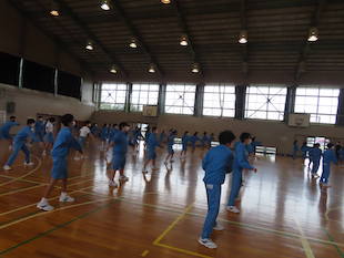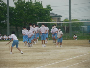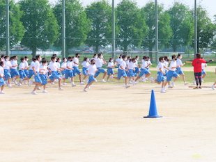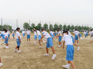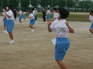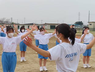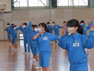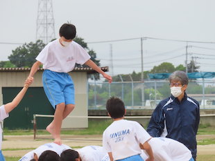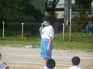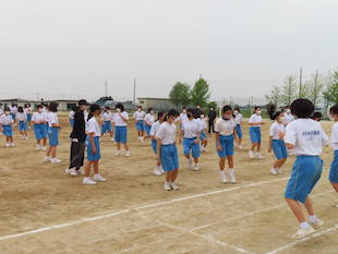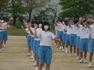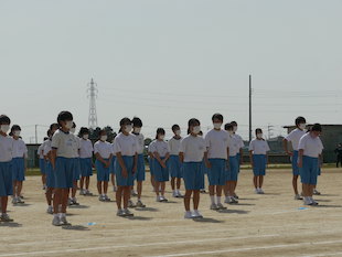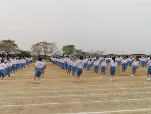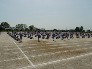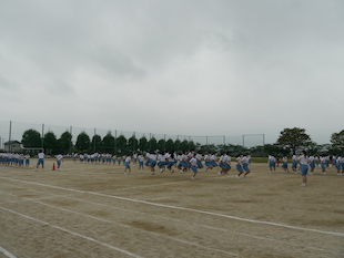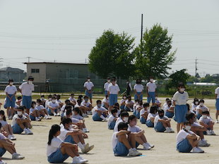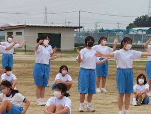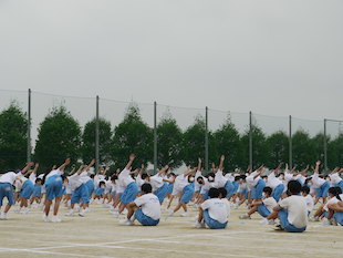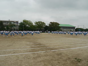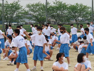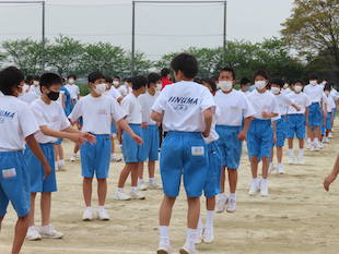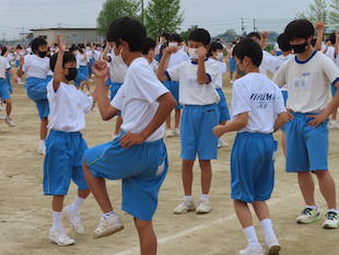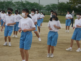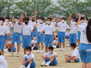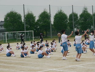最後に全校生徒で演技となった時、3年生の中から朝礼台で演技するリーダーを募りました。最初は、みんな躊躇していましたが、やがて生徒のひとりが「やります!」と大きな声で返事をし、朝礼台に上り、リーダーとして立派に全校生徒をリードしてくれました。朝礼台での演技が素晴らしかったのはもちろんのことですが、私が感心したのは、列の後方にいたその生徒が、全力疾走で朝礼台にやってきて、演技が終わるとまた全力疾走で自分の場所へ戻ったことです。その動きを見て、とても清々しい気持ちになりました。またひとつ飯沼中の良さを見つけました。