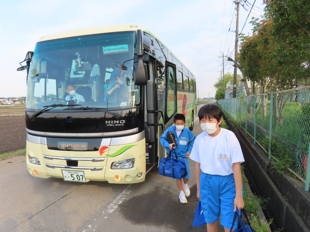 バスが無事学校に到着しました。体調を崩したり、大きな怪我をする人もなく無事に帰校することができました。保護者のみなさまには、大変お世話になりました。今夜はたくさん話を聞いてあげてください。そして「へこたれずに」1日がんばったことをたくさん褒めてあげてください。