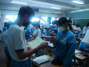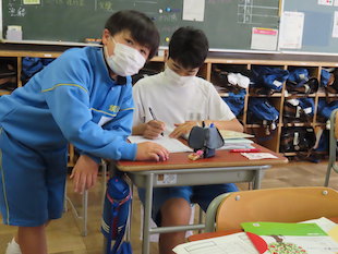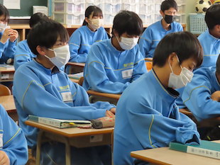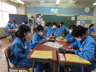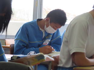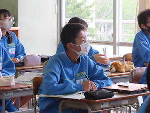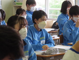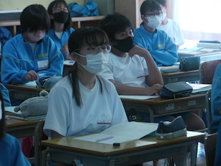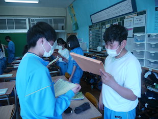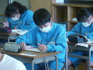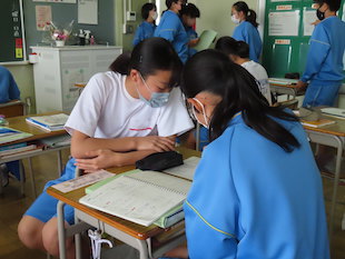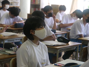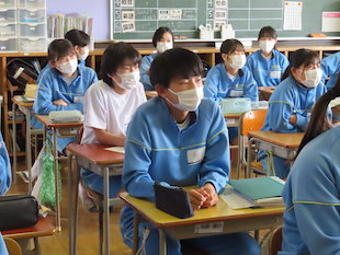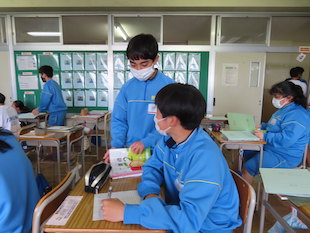 今日も教室を訪問するといくつもの工夫をこらした楽しく学べる授業が展開されていました。美術では、ワークシートを元に「美ンゴ」という活動をしていました。活動の中で美術教員の「自由な発想で描いていいんですよ」と生徒の豊かな発想を大切にする発言が印象的でした。保健体育の授業では、昨日に引き続き、3年生が1年生にラベンダー体操『疾風バージョン』を教えていました。演技の後の先輩のアドバイスの時に3年生からまず「おつかれさま!」という労いの言葉がけがあり、とても優しい気持ちになることができました。また、英語の授業では、”What do you want to be in the future?”という質問に、 “I haven’t decided yet.”という答えが返ってきていました。飯中での豊かな体験的活動を重視した学習の中から、将来の夢が見つかるといいですね。