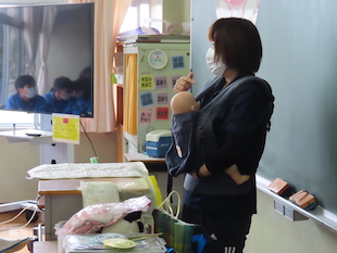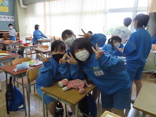 また、本日お邪魔したクラスでは、家庭科の授業が行われていて、私がお邪魔したときは、赤ちゃんのおむつの交換について話をしていました。赤ちゃんの人形を抱いてみて「最初はちょっと緊張した。」とか、「重くて驚いた」などの声が聞こえました。実際に体験することで初めてわかることはたくさんあります。知識としての学習だけでなく、こうして体験的学習を多く取り入れることで、たくさんの「気づき」があるように教育活動を進めています。