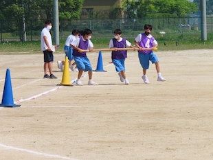 午後の活動は、体育祭の練習を兼ねたラベンダー体操とハリケーン(台風の目)でした。動きやルールを確認しながら活動をし、最後には、ハリケーンのレースを行いました。