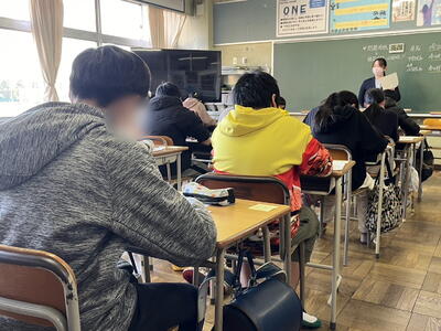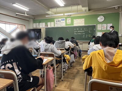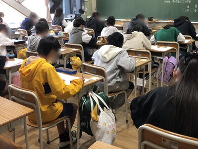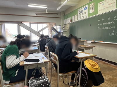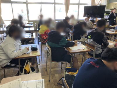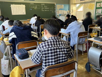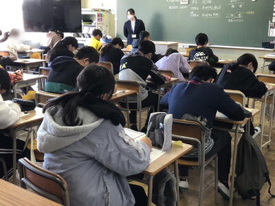 本日の授業の様子です。3年生の英語の授業では、日常会話を反復して覚えるDangan Input活動を行っていました。欠席の関係でペアが見つからなかった生徒は急遽私がペアとなり練習をしました。(私の教科は英語です。)また社会の授業では、受験を見据え、総合的な問題に取り組んでいました。今日で2学期の教科の授業は最後となります。3年生は冬休み期間も学習の場として学校を開放します。来る受験に向け大切な時。冬休みもがんばってください。