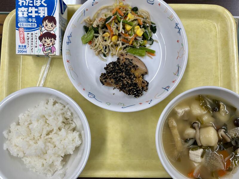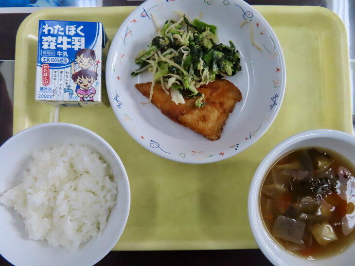 ごはん、牛乳、かれいの立田揚げ、青菜のごまみそあえ、根菜汁