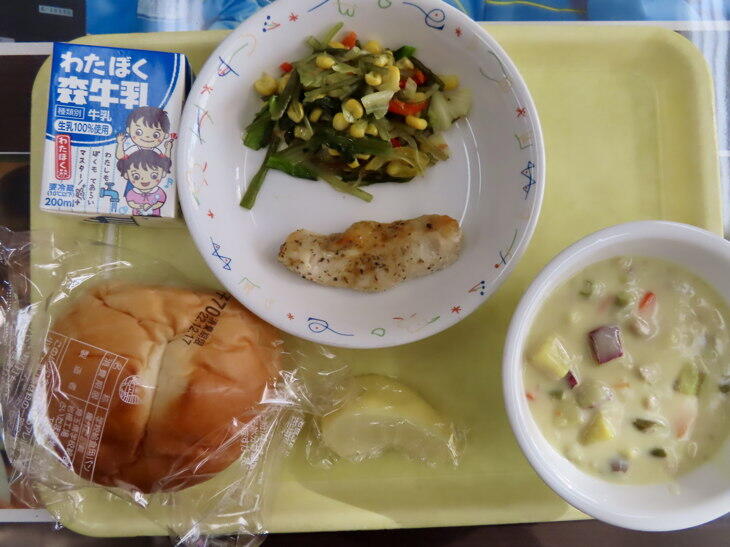子どもパン、牛乳、とり肉のハーブ焼き、さつまいものシチュー、彩り野菜のサラダ