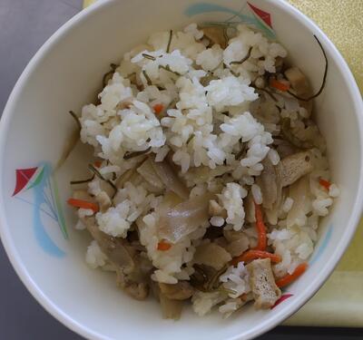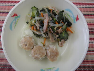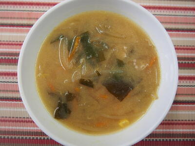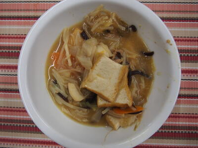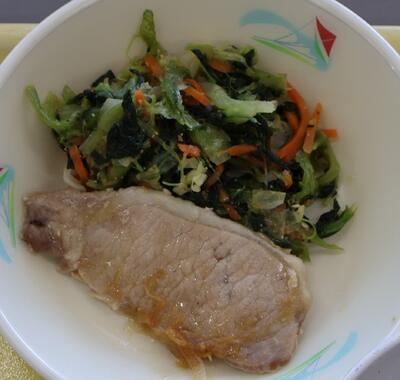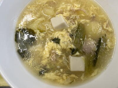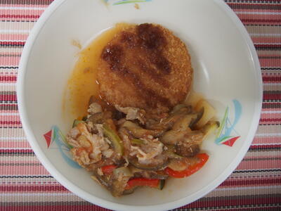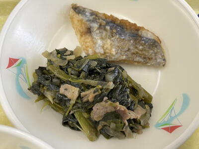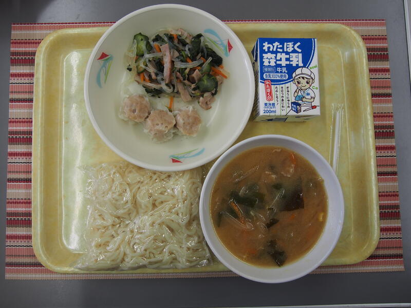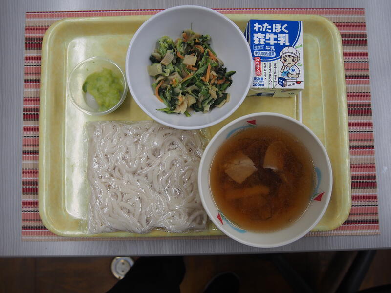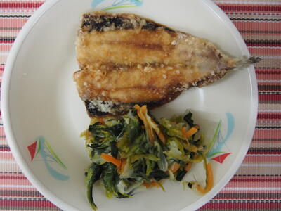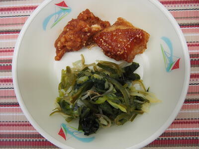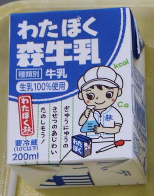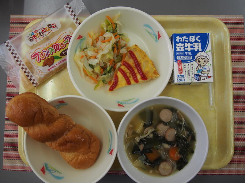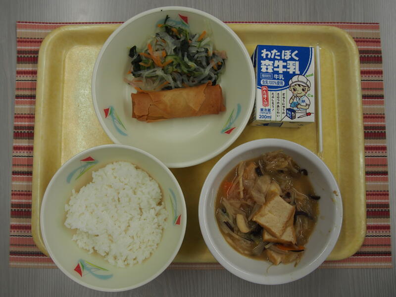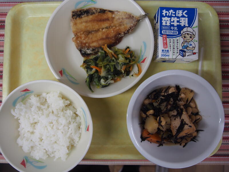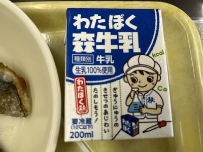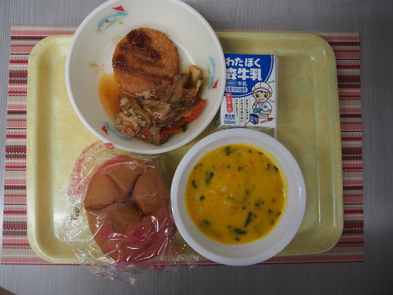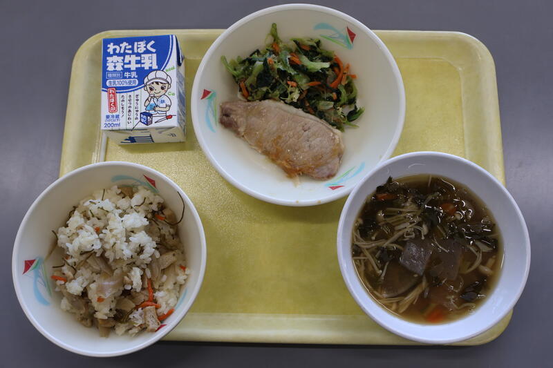 牛乳、ごはん、さわらの竜田揚げ、アスパラガスとベーコンのバター醤油、卵スープ