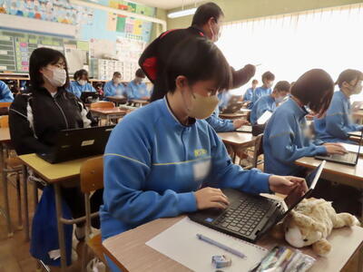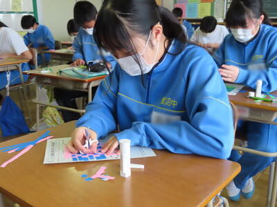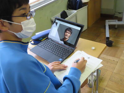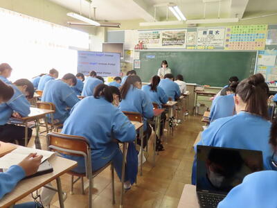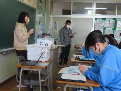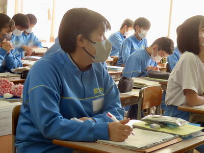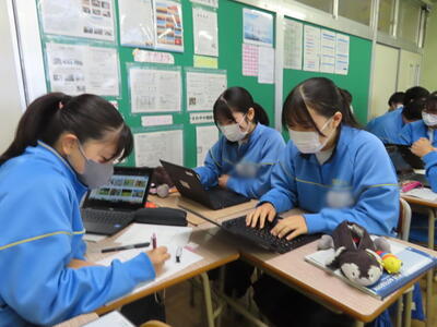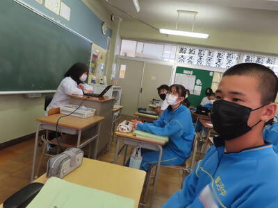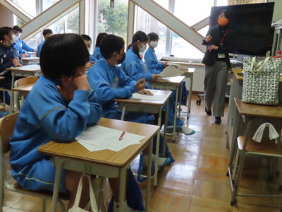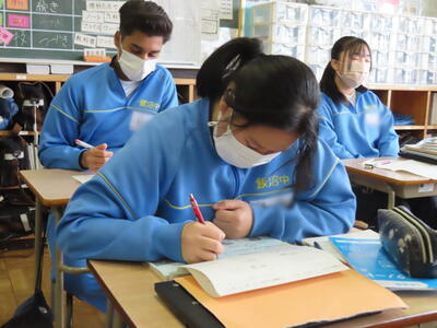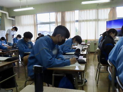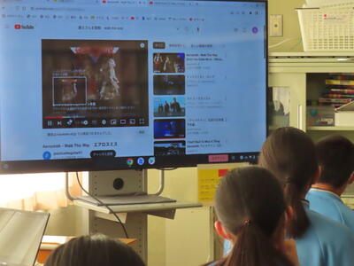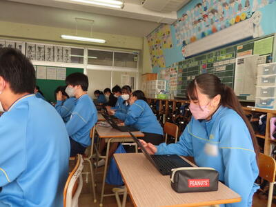 英語の授業では、英語の歌の歌詞を聞き取る活動をしていました。楽しみながら英語の力がつきますね。