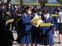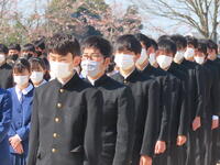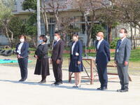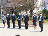 始業式は、感染症防止対策のため、校庭で行われました。この日は、暖かな春の日差しで、校庭での始業式もよいものだと感じました。校長の話と職員紹介がありましたが、生徒たちは非常にしっかりとした態度を話を聞くことができました。