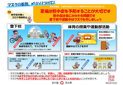 (1)健康観察の徹底 ア 日々の健康状態を確認するため、検温・健康観察の徹底をお願いします。 イ 夏季休業中の児童生徒の健康状態を把握するためにICTや健康観察アプリを活用するなど連絡手段の確認をしておいてください。 ウ 発熱や倦怠感、喉の違和感等の風邪症状があるなど、普段と体調が少しでも異なる場合や家庭内に体調不良者がいる場合には、自宅での休養(登校自粛)を徹底し、医療機関への受診をお願いします。 (2)手洗い・適切なマスクの着脱の実施 手洗い及び適切なマスクの着脱の徹底をお願いします。 (3)換気の徹底 ア 常時換気の徹底 常時換気の際は、対角の窓や戸を10~20cm程開け、空気の流れを作るようにしましょう。常時換気が難しい場合には、30分に1回以上定期に窓を全開し換気しましょう。 イ エアコン使用時の換気 |