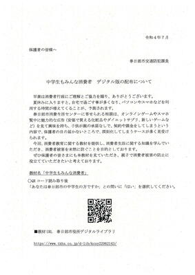 春日部市役所交通防犯課より、 消費教育に関する案内が届きました。保護者のみなさまにも教材をごらんいただき、親子で消費者被害の防止に役立てていただきたいとのことですので、ご案内いたします。下記のリンクよりPDFファイルをDLし、QRコードよりお進みください。 |