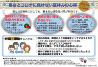 | 夏季休業中の感染症対策について 感染症が猛威をふるっています。感染力が更に強いとされる新たな変異株への置き換わりが懸念されています。 夏季休業中も家庭や学校外での感染防止を図るため、 下記のとおり夏季休業に向けた新型コロナウイルス感染症対策の留意点をまとめました 。リーフレットを参考に、ぜひご家庭でもご協力をお願いいたします。(7月29日) |