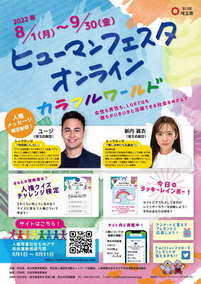 | 8 月は人権尊重社会をめざす県民運動強調月間です。 埼玉県では、強調月間に合わせ、人権について皆様と一緒に考えるオンラインイベントや県民講座、啓発ポスター掲示など様々な取組を実施しています。 |