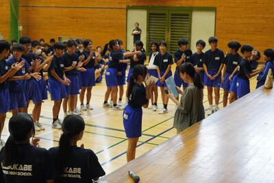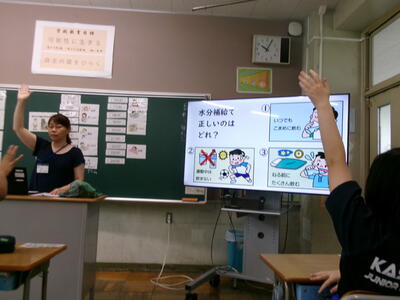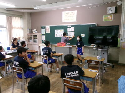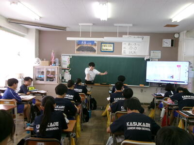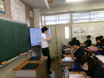 先輩方の授業を見学したあとは、本校の生活についてクイズ形式で説明させていただきました。