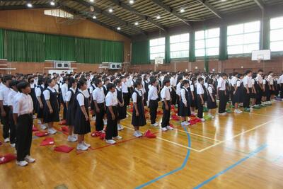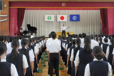 41日間の夏休みも終わり、本日から2学期が始まり、始業式が行われました。各学年の代表者より勉強や合唱祭を頑張りたいという2学期の抱負が発表されました。みんなも同じ気持ちの人が多いようで、校歌にもその意気込みが感じられました。