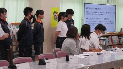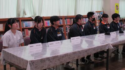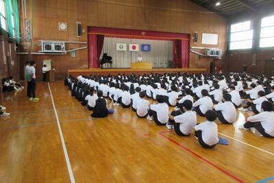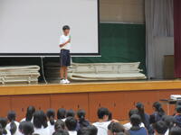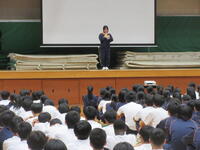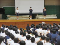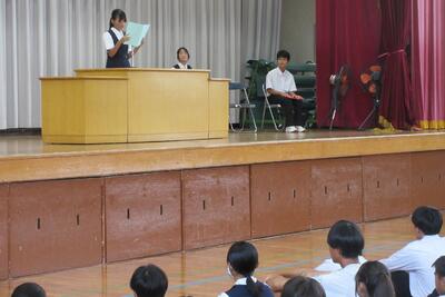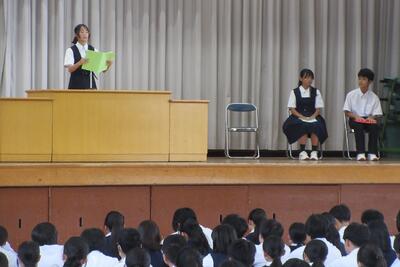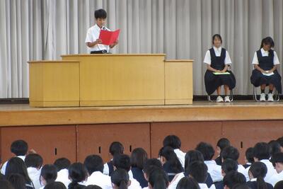 明日から新人体育大会兼第38回県民総合スポーツ大会地区予選会が始まります。各部活動から大会に向けての抱負などの発表がありました。どの部も大会への意気込みが伝わりました。その後、夏休み等で受賞した賞状の伝達がありました。