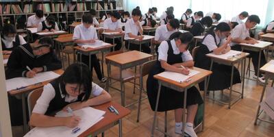 本日、春日部市内の中学校2年生が行っているGTEC(スコア型英語テスト)を実施しました。スコア型英語テストとは、小学生から社会人まで英語力が測定できる技能テストです。スピーキングのテストもあり、タブレットからの音声を聞いて、マイクに向かって解答します。