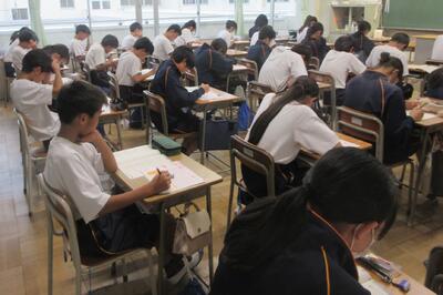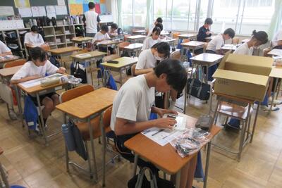 本日3年生は、第2回東部地区学力検査を実施しました。県立高校入試問題を想定した問題を東部地区の中学校3年生が全員受験するので、自分の実力と志望校との比較ができる大切なテストになっています。夏休みに頑張った成果が出るといいですね。
