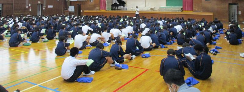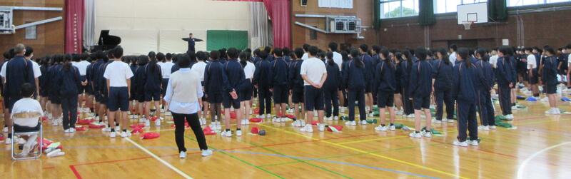 本日午後、体育館において全校生徒の「はじまりの歌声集会」が合唱祭実行委員が主体となって行われました。10月17日(金)の合唱祭に向けて、スローガンの発表や各クラスの意気込みの発表がありました。また、有志合唱団がリードしながら全校合唱の「夢の世界を」を練習しました。