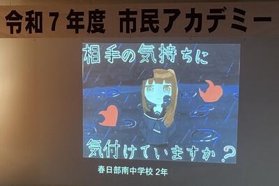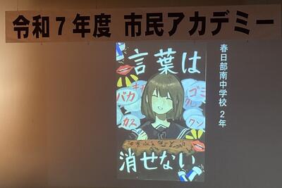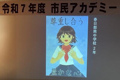 本日、粕壁市民センターにおいて、「市民アカデミー」が開催されました。本校の生徒3人のポスターが展示されました。