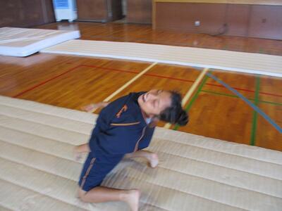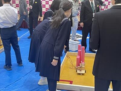 試合に向け、生徒達は実際に使われる物と同じ競技台を使って、実践練習及びマシンの調整を行っていました。頑張れ技術部!