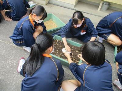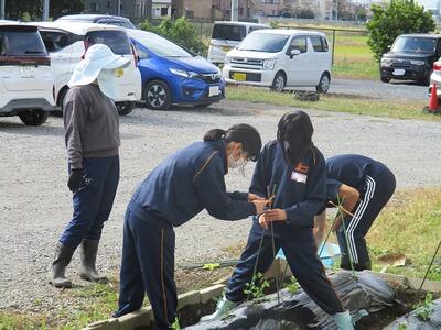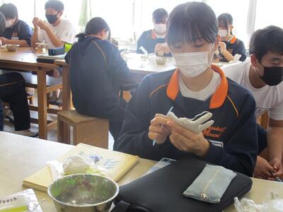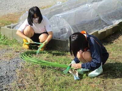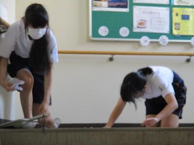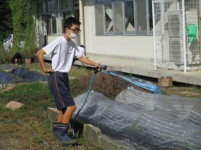 2年生の技術科の授業では、自分達で育てている「小松菜」の収穫を楽しそうに行っていました。