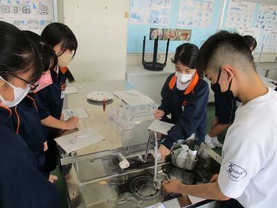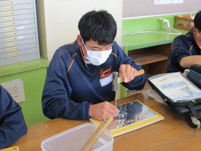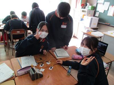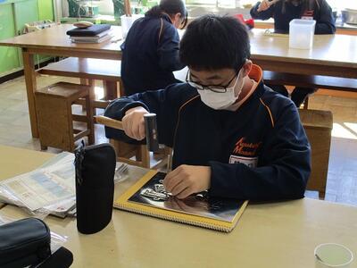 2年生の理科では「電圧を変えて、電流の大きさと調べる」実験を、1年生の美術では、「よく見てみると、じっくり見ると面白い立体」を制作していました。