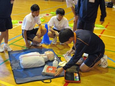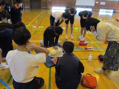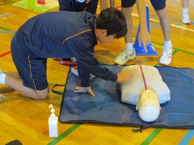 本日、1,2限に2年生の保健体育の授業で、春日部市消防本部警防課の方を講師にお招きして「救急救命講習」を行いました。