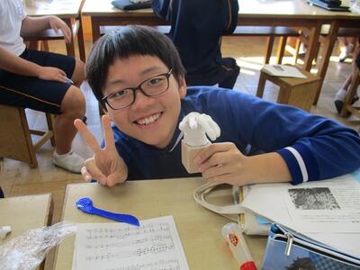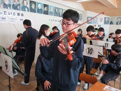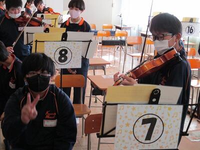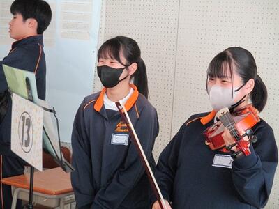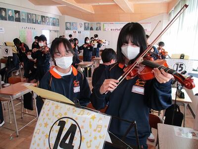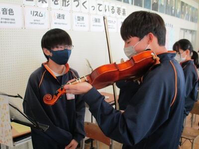 音楽の授業では、バイオリンの実技テストを行っていました。バイオリンの授業も、2学期で終了となります。生徒のバイオリンを弾く素敵な姿が見られなくなるのがとても寂しいです。