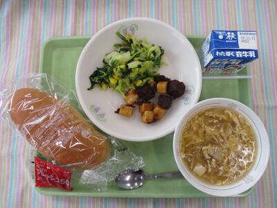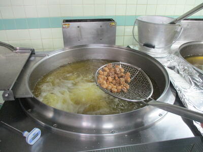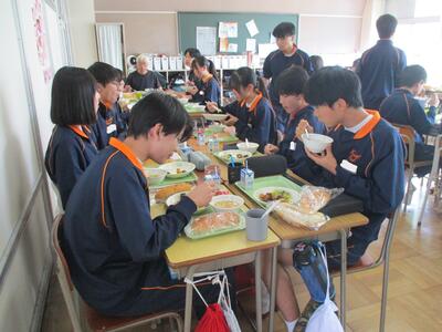 今年は『おいしい給食』をテーマにした献立でした。メインは「鯨の竜田揚げ」。ほとんどの生徒が初めて鯨を食べました。感想は…。栄養教諭の先生に聞くと「残菜、ほぼありませんでした!!」生徒に大好評でした。