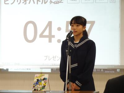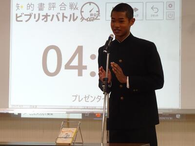 10日(日)、春日部市武里大枝市民センターにおいて、春日部市立武里図書館主催のビブリオバトルに本校から3人が出場しました。お気に入りの本を紹介し、観覧者が投票をします。本校の2年生が見事優勝しました。