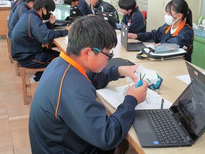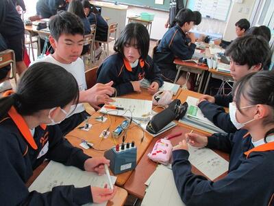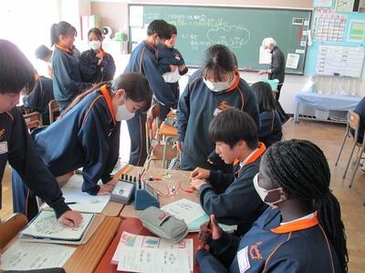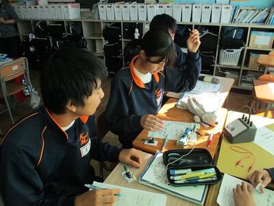 2年生の理科では「電圧を変えて、電流の大きさと調べる」実験を、1年生の美術では、「よく見てみると、じっくり見ると面白い立体」を制作していました。