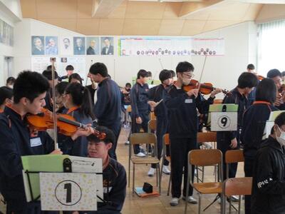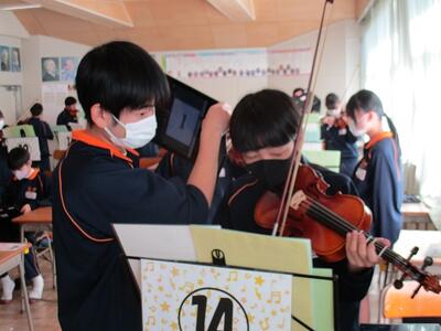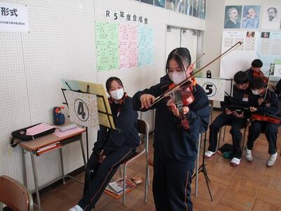 音楽の授業では、バイオリンの実技テストを行っていました。バイオリンの授業も、2学期で終了となります。生徒のバイオリンを弾く素敵な姿が見られなくなるのがとても寂しいです。