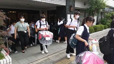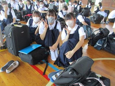 体育館で合同朝の会を行った後に、荷物の積み込みを行いました。