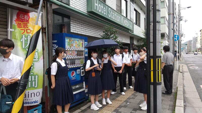 荷物の積み込みを済ませてから、元気にホテルの方々にあいさつして移動です。近くにある東本願寺の横まで行き、バスに乗車です。