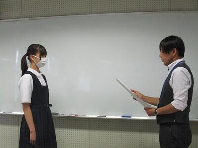 今、1年生が行っています。好きな教科や部活動、将来の夢等について校長先生から質問されます。
