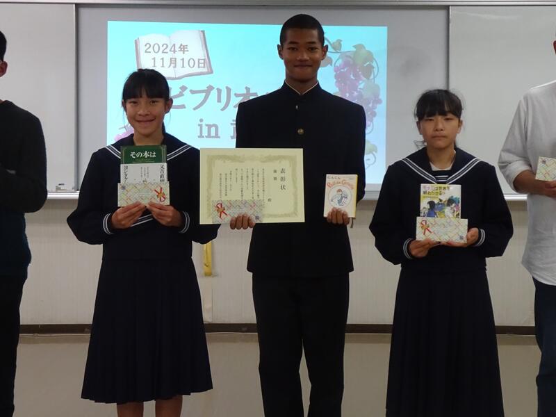 10日(日)、春日部市武里大枝市民センターにおいて、春日部市立武里図書館主催のビブリオバトルに本校から3人が出場しました。お気に入りの本を紹介し、観覧者が投票をします。本校の2年生が見事優勝しました。