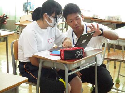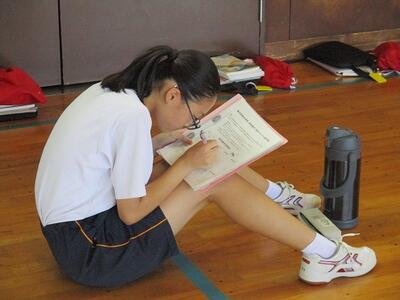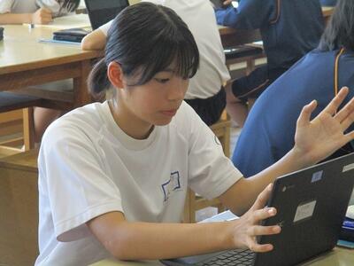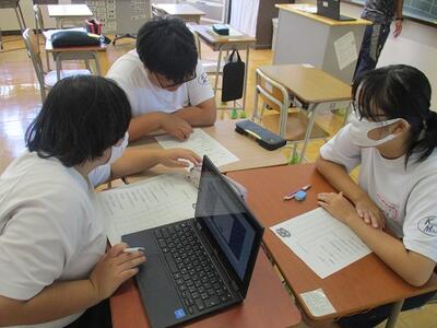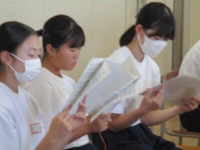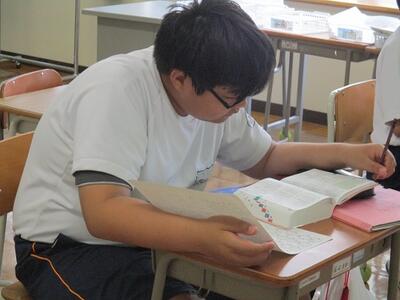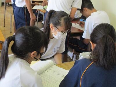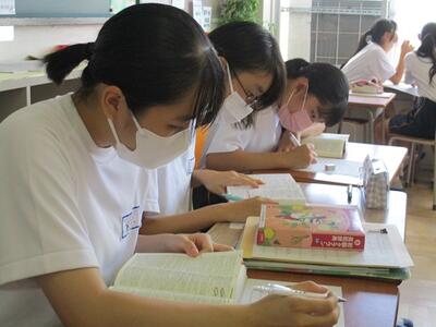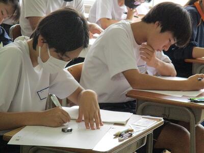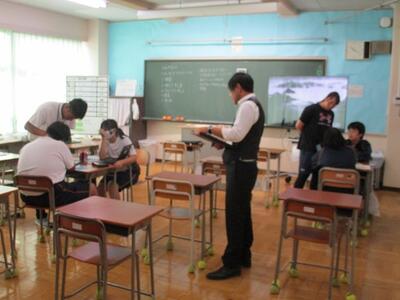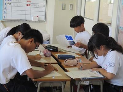 外は台風13号の影響で、風も強く荒れていますが、教室内には落ち着いた爽やかな風が吹いています。南中生は台風なんかに負けません!