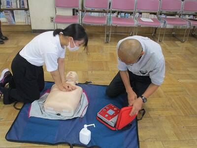 AED講習は、とても重要な講習と位置づけています。訓練のための訓練ではなく、いざと言うときに、確実に行動できる実践訓練として、教職員全員がしっかりと取り組みました。