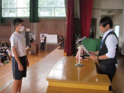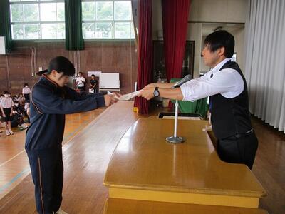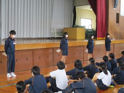 出席確認後、体育館で対面式の表彰集会を行いました。