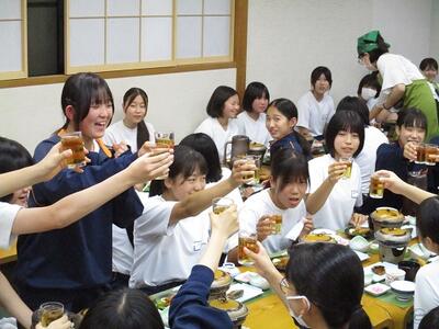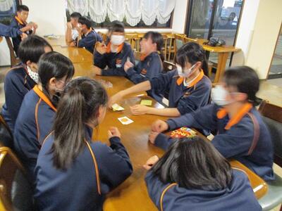 健康観察、部屋の点検、食事の準備など、それぞれが係の仕事に取り組み、今は入浴、食事後のゆとりタイムです。レストランに集まったり、部屋で過ごしたり、仲間と楽しい時間を過ごしています。