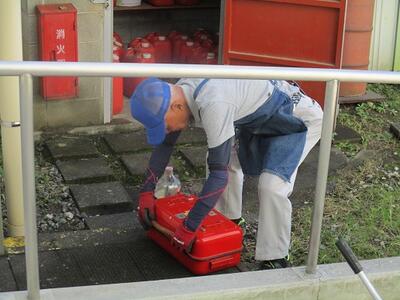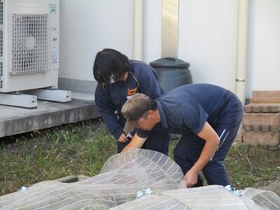 体育館で合同朝の会を行った後に、荷物の積み込みを行いました。