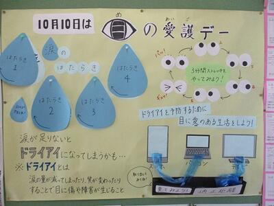 10月バージョンは、養護教諭指導の下、養護実習で来ていた2名の実習生が作成した「涙の働き」についてのものと、保健委員会の生徒が作製した「おしゃれ障害」についての研究をまとめたものです。どちらも本当に素晴らしい出来栄えです。ぜひ見にきてください。