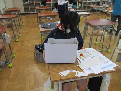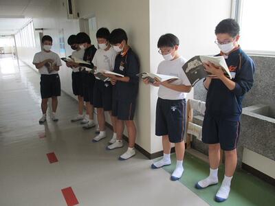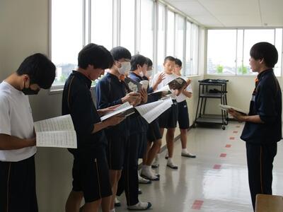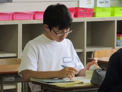 明日から期末テストです。図書室で勉強している生徒を見つけました。また、現在1年生を対象に校長面接が行われています。これから2、3年生も行われる予定です。