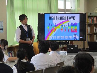 春日部警察署生活安全課生活安全・サイバー捜査係の方と少年指導員6名の方にお越しいただ、ネット犯罪に巻き込まれないためのポイントなどについて、お話をしていただきました。