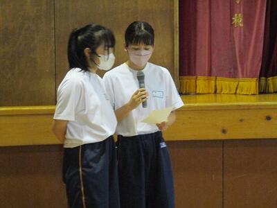 生徒が司会進行を務め、各クラスの代表者による作文発表や修学旅行、進路についての説明がありました。
