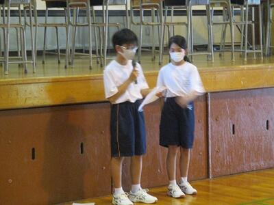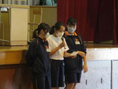 出席確認後、体育館で対面式の表彰集会を行いました。