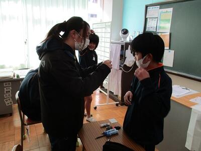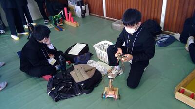 2年生の理科では「電圧を変えて、電流の大きさと調べる」実験を、1年生の美術では、「よく見てみると、じっくり見ると面白い立体」を制作していました。