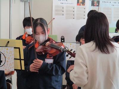 音楽の授業では、バイオリンの実技テストを行っていました。バイオリンの授業も、2学期で終了となります。生徒のバイオリンを弾く素敵な姿が見られなくなるのがとても寂しいです。