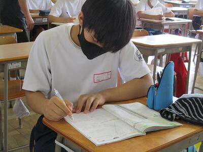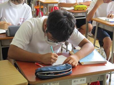 外は台風13号の影響で、風も強く荒れていますが、教室内には落ち着いた爽やかな風が吹いています。南中生は台風なんかに負けません!