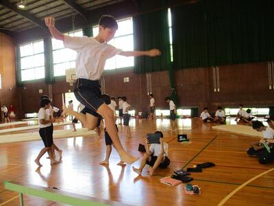 体育の授業では、生徒達が自分で考えて技を工夫したり、難しい技にもチャレンジしていました。