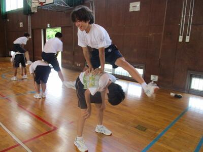 体育の授業では、生徒達が自分で考えて技を工夫したり、難しい技にもチャレンジしていました。